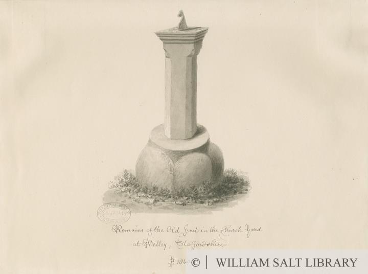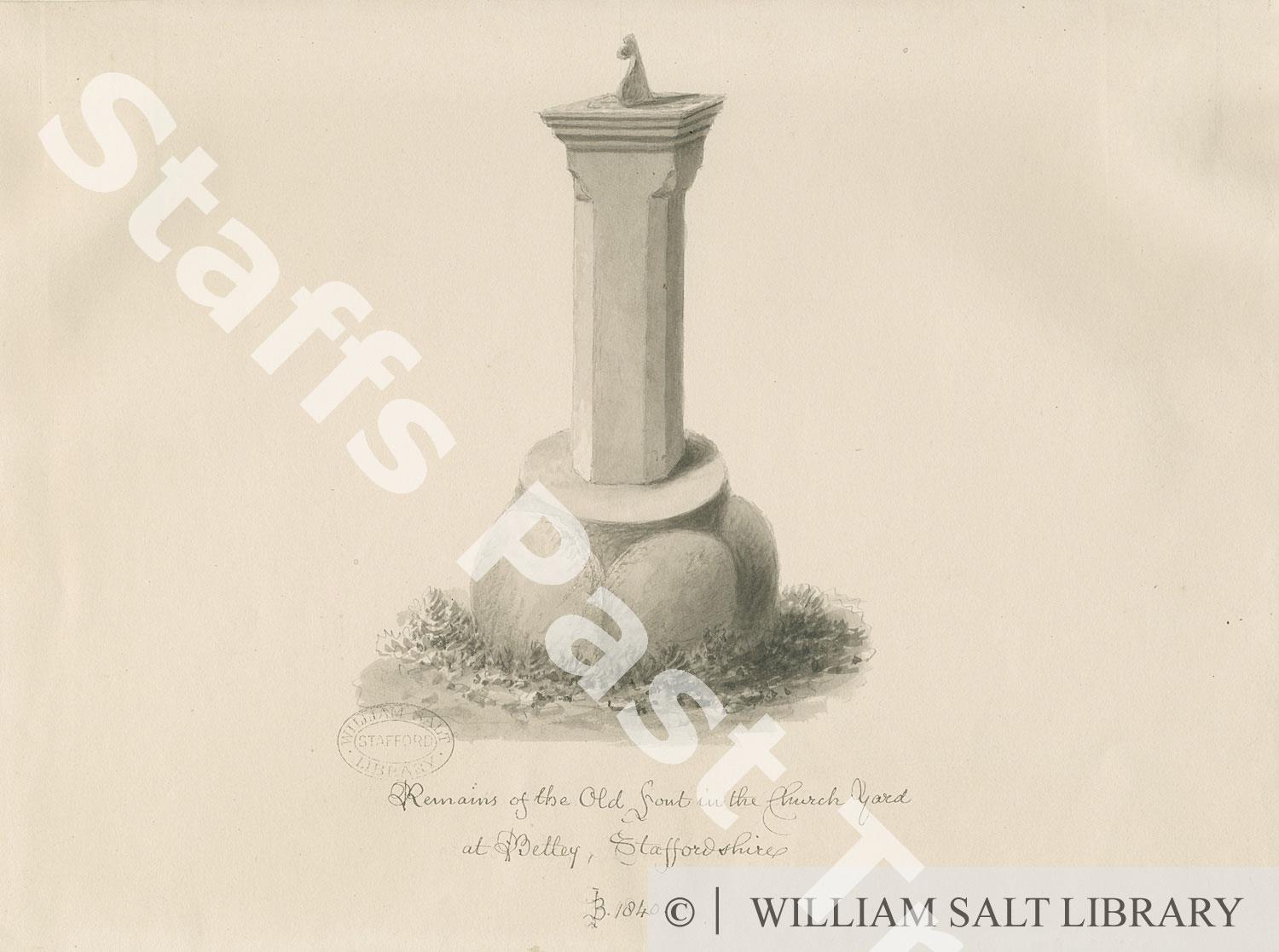 Description:'Remains of the Old Font in the Church Yard at Betley, Staffordshire,' overturned for use as a sun-dial. The inverted bowl has half-inch round bulges, and the shaft is square with bevelled edges.'J. B.,' [John Buckler].